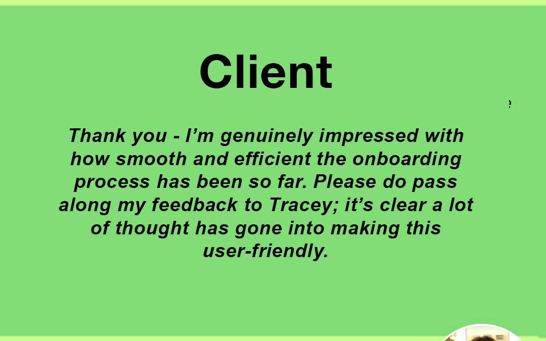 Testimonial reads – Thank you – I’m genuinely impressed with how smooth and efficient the onboarding process has been so far. Please do pass along my feedback to Tracey; it’s clear a lot of thought has gone into making this user-friendly.